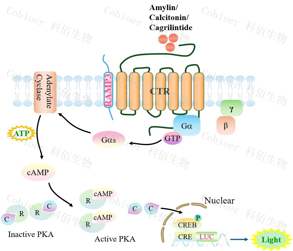 CTR&RAMP3 CRE-Luc CHO 報告基因藥靶模型很好的模擬了體內 CTR&RAMP3 的信 號轉導過(guò)程,原理見(jiàn)下圖所示。![]() Figure 1. CTR&RAMP3 CRE-Luc CHO 細胞模型原理圖 |