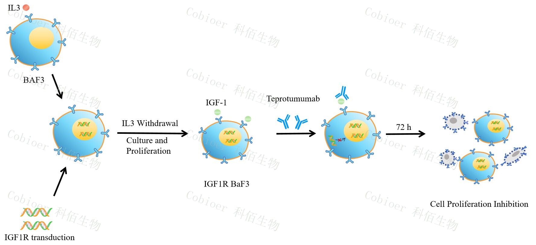 BaF3(小鼠原 B 細胞)的生長(cháng)和增殖需要 IL-3 的維持。通過(guò)引入各種表達激酶的基因, 能作為 BaF3 的驅動(dòng)基因,讓 BaF3 不再依賴(lài) IL-3 而增殖,進(jìn)而激酶基因成為 BaF3 增殖依 賴(lài)的驅動(dòng)基因,用于評估小分子藥物對激酶的靶向抑制作用,原理及流程見(jiàn)下圖所示。![]() Figure 1. IGF1R BaF3 細胞模型原理圖 |