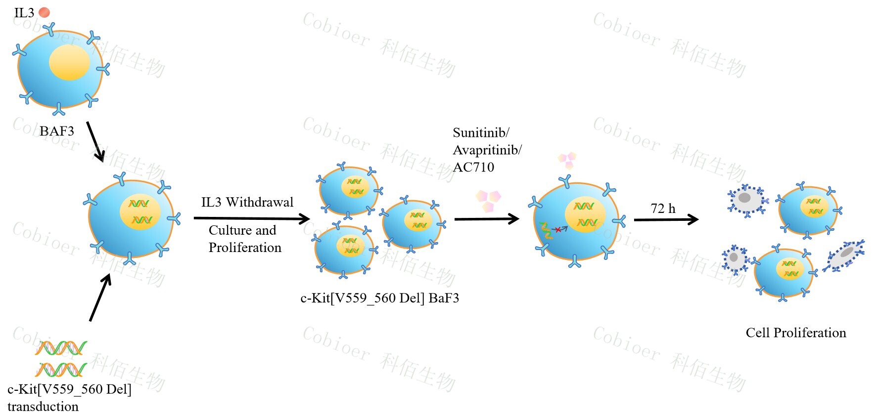 c-Kit[V559_560 Del] BaF3 藥 靶 細(xì) 胞 , 通過轉(zhuǎn)導(dǎo)缺失狀態(tài)的 c- Kit[V559_560 Del] 基因到 BaF3 細(xì)胞系中,穩(wěn)定表達(dá)人缺失形態(tài)下的 c-Kit[V559_560 Del] 基因。