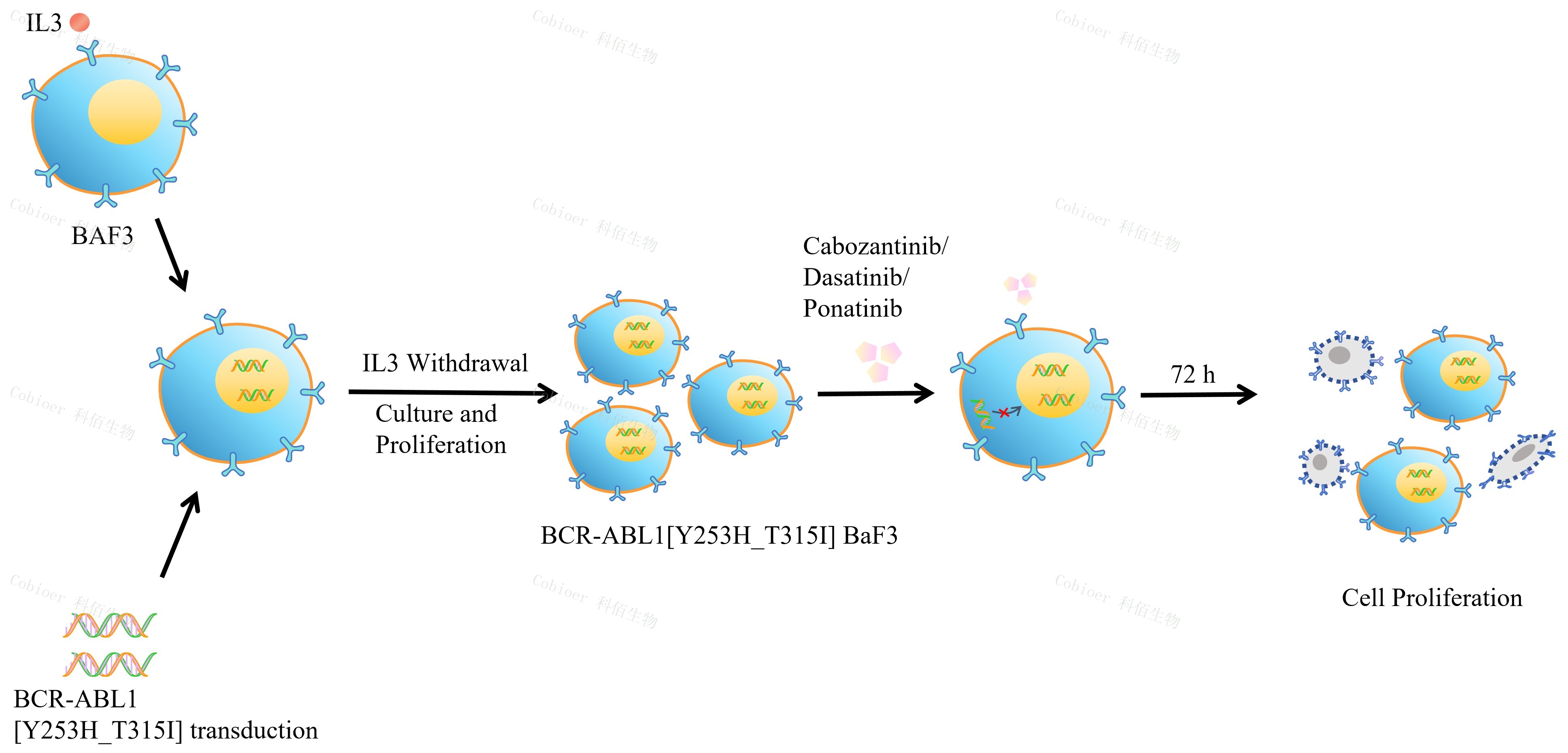 BaF3(小鼠原 B 細(xì)胞)的生長(zhǎng)和增殖需要 IL-3 的維持。通過(guò)引入各種表達(dá)激酶的基因, 能作為 BaF3 的驅(qū)動(dòng)基因,讓 BaF3 不再依賴 IL-3 而增殖,進(jìn)而激酶基因成為 BaF3 增殖依賴的驅(qū)動(dòng)基因,用于評(píng)估小分子藥物對(duì)激酶的靶向抑制作用,原理及流程見(jiàn)下圖所示。