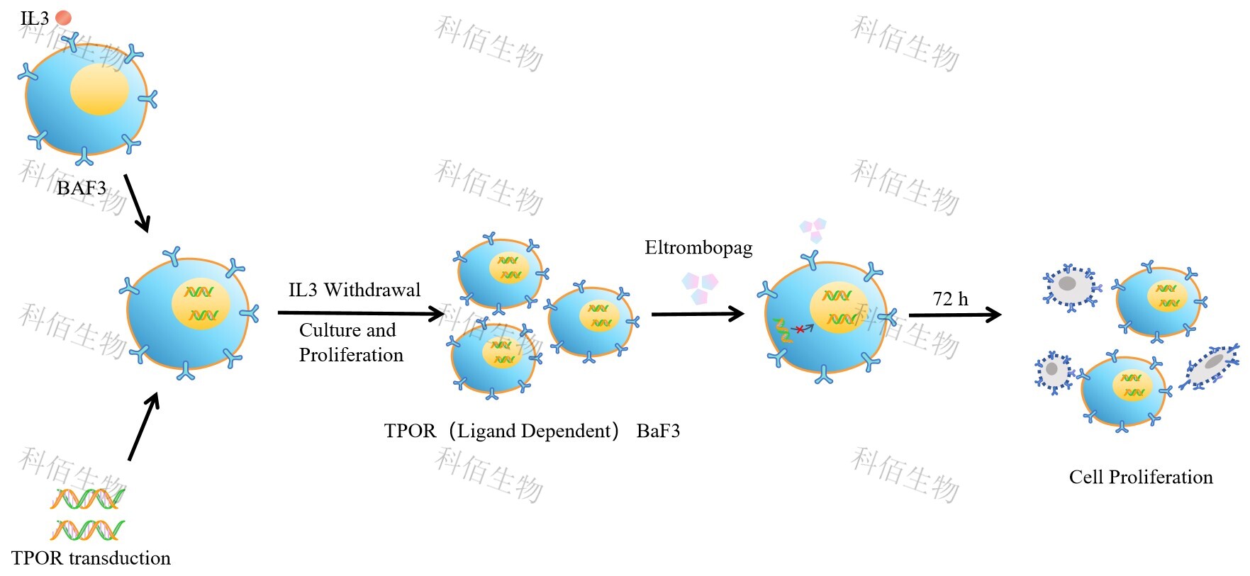 TPOR(Ligand Dependent) BaF3 藥靶細胞,通過(guò)轉導野生狀態(tài)的 TPOR 基 因到 BaF3 細胞系中,穩定表達人野生形態(tài)下的 TPOR 基因。 BaF3(小鼠原 B 細胞)的生長(cháng)和增殖需要 IL-3 的維持。通過(guò)引入各種表達激酶的基因, 能作為 BaF3 的驅動(dòng)基因,讓 BaF3 不再依賴(lài) IL-3 而增殖,進(jìn)而激酶基因成為 BaF3 增殖依賴(lài)的驅動(dòng)基因,用于評估小分子藥物對激酶的靶向抑制作用,原理及流程見(jiàn)下圖所示。