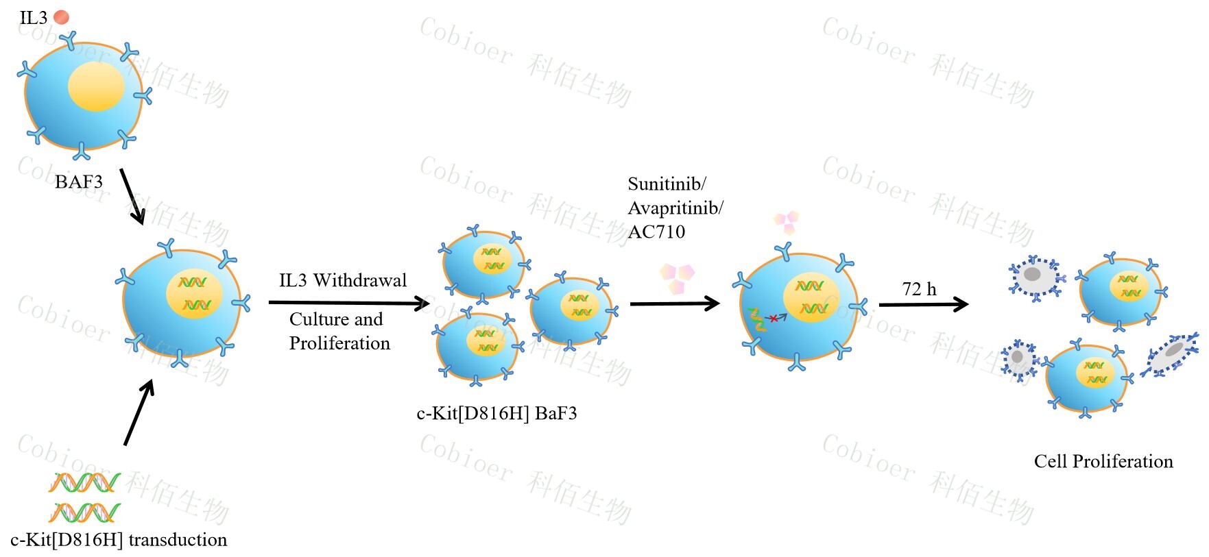 | c-Kit[D816H] BaF3 藥靶細(xì)胞,通過轉(zhuǎn)導(dǎo)突變狀態(tài)的 c-Kit[D816H] 基因 到 BaF3 細(xì)胞系中,穩(wěn)定表達(dá)人突變形態(tài)下的 c-Kit[D816H] 基因。 BaF3(小鼠原 B 細(xì)胞)的生長和增殖需要 IL-3 的維持。通過引入各種表達(dá)激酶的基因, 能作為 BaF3 的驅(qū)動(dòng)基因,讓 BaF3 不再依賴 IL-3 而增殖,進(jìn)而激酶基因成為 BaF3 增殖依 賴的驅(qū)動(dòng)基因,用于評(píng)估小分子藥物對(duì)激酶的靶向抑制作用,原理及流程見下圖所示。 ![]() Figure 1. c-Kit [D816H] BaF3 細(xì)胞的構(gòu)建原理圖 |
