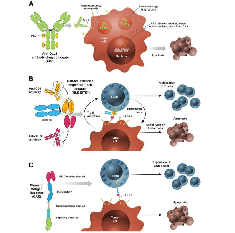 DLL3(Delta-Like Ligand 3, Delta樣配體3)在小細胞肺癌(SCLC)及神經(jīng)內分泌腫瘤(NENs)的治療領(lǐng)域迅速崛起,成為全球藥企競相追逐的明星靶點(diǎn)。目前大部分靶向DLL3的藥物主要包括ADC、TCE、單抗、雙抗、三抗、CAR-T等。隨著(zhù)安進(jìn)(Amgen)的Tarlatamab(一款靶向DLL3/CD3的雙特異性T細胞接合劑)獲批上市,恒瑞醫藥、羅氏等藥企的ADC(抗體偶聯(lián)藥物)和雙抗/三抗管線(xiàn)在臨床I/II期試驗中均展現出令人驚艷的數據。