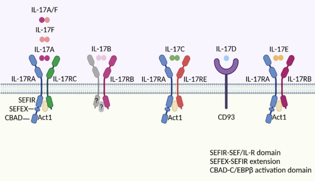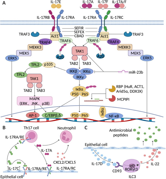 IL-17 細胞因子具有一個(gè)半胱氨酸環(huán)結構,它們會(huì )與特定的 IL-17R 受體結合,通過(guò) SEFIR、SEFEX 和 CBAD 結構域激活免疫信號傳導。IL-17 信號傳導始于 IL-17A/A、IL-17A/F 或 IL-17F/F 細胞因子與其受體(IL-17RA 和 IL-17RC)的結合,或者 IL-17E/E 細胞因子與其受體(IL-17RA 和 IL-17RB)的結合。當配體結合后,Act1 會(huì )激活多種獨立的信號傳導途徑,這些途徑通過(guò)不同的 TRAF 蛋白介導。TRAF6 的激活會(huì )導致 NF-κB、C/EBPβ、C/EBPδ 和 MAPK 信號通路的觸發(fā)。IL-17R-Act1 復合物還通過(guò) TRAF4 與 MEKK3 和 MEK5 結合,從而激活 ERK5。不同類(lèi)別的抑制劑,如泛素酶(TRAF3)、去泛素酶(A20)、RBP(HuR、ACT1、Aridα 和 DDX3X)、內切核糖核酸酶(MCPIP1/Regnase-1)和微小 RNA(miR-23b),通過(guò)各種獨立的機制負向調節 IL-17 信號傳導。IL-17C 主要由上皮細胞表達。當 IL-17RA/RE 受體復合物表達時(shí),上皮細胞本身和 TH17 細胞都是 IL-17C 的作用靶點(diǎn)。除了增加 Th17 細胞中 IL17A 的表達外,IL-17C 還通過(guò)間接方式增強吸引中性粒細胞的趨化因子在上皮細胞中的表達,最終導致強烈的炎癥反應。