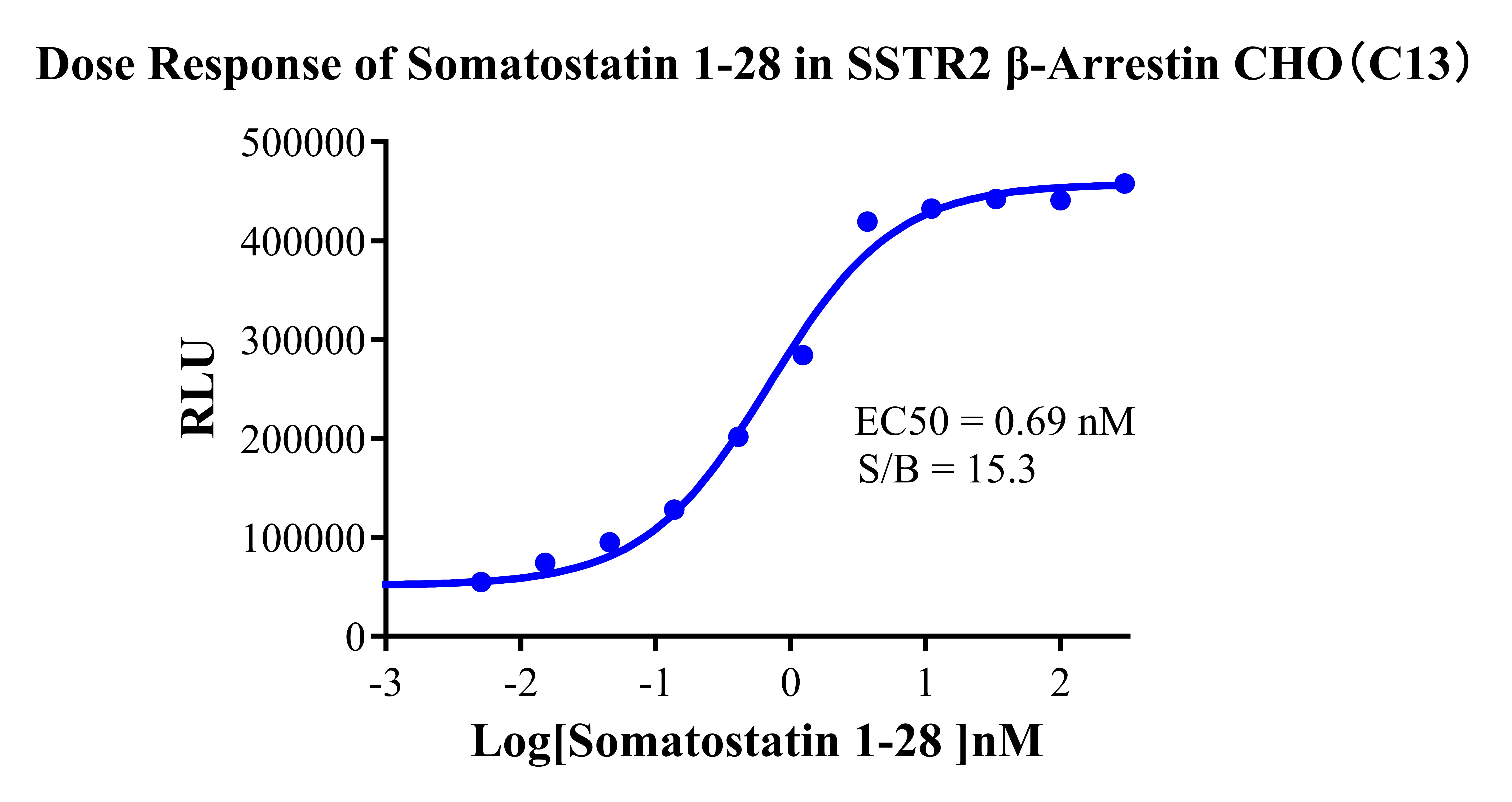SSTR2 β-Arrestin CHO 報告基因藥靶模型很好的模擬了體內 SSTR2/β-Arrestin 的信號 轉導過(guò)程,原理見(jiàn)下圖所示。當缺乏配體刺激時(shí),β-Arrestin 不與 SSTR2 結合,融合β- Arrestin 的熒光素酶處于失活構象,當 SSTR2 遭遇配體刺激時(shí),融合熒光素酶報告基因的 β-Arrestin 被招募,使熒光素酶報告基因處于激活狀態(tài),加入其底物后發(fā)光信號增強。