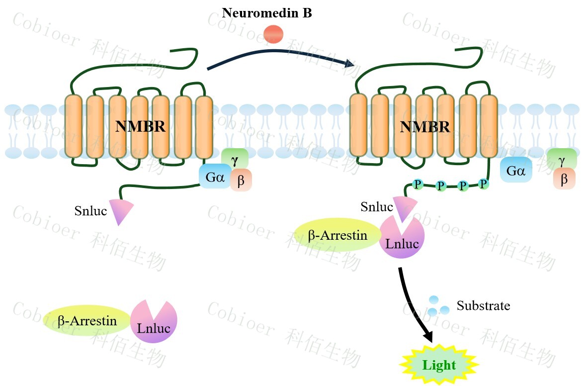 NMBR(BB1) β-Arrestin CHO 報告基因藥靶模型很好的模擬了體內 NMBR/β-Arrestin 的信號轉導過(guò)程,原理見(jiàn)下圖所示。當缺乏配體刺激時(shí),β-Arrestin 不與 NMBR 結合,融合β- Arrestin 的熒光素酶處于失活構象,當 NMBR 遭遇配體刺激時(shí),融合熒光素酶報告基因的 β-Arrestin 被招募,使熒光素酶報告基因處于激活狀態(tài),加入其底物后發(fā)光信號增強。![]() Figure 1. NMBR(BB1) β-Arrestin CHO 細胞模型原理圖 |