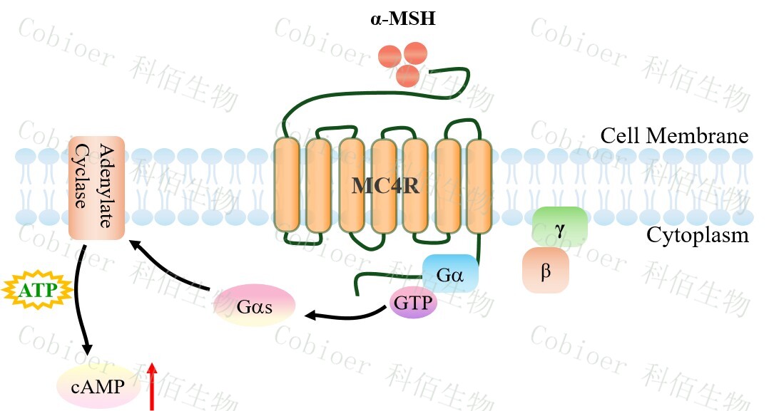 黑皮質(zhì)素 4 受體(MC4R)是黑皮質(zhì)素受體家族成員之一,其家族成員還包括:MC1R、 MC2R、MC3R 和 MC5R。該家族也是 GPCR 超家族中具有重大治療前景的一個(gè)亞家族, 屬于視紫紅質(zhì)樣 A 類(lèi) GPCR。MC4R 主要分布于下丘腦室旁核、杏仁核等食欲與能量平衡 調控中樞,其內源性激動(dòng)配體為α-黑素細胞刺激素(α-MSH),拮抗配體為刺豚鼠相關(guān)蛋 白(AgRP);該受體通過(guò)偶聯(lián) Gs 蛋白激活腺苷酸環(huán)化酶,引起 cAMP 升高,從而啟動(dòng) PKA/CREB 信號通路,并介導β-arrestin 依賴(lài)的 MAPK 活化,核心功能為抑制食欲、促進(jìn)能 量消耗,其功能喪失性突變直接導致單基因肥胖、胰島素抵抗及代謝綜合征,而功能獲得 性突變則與反常的瘦表型相關(guān)。
