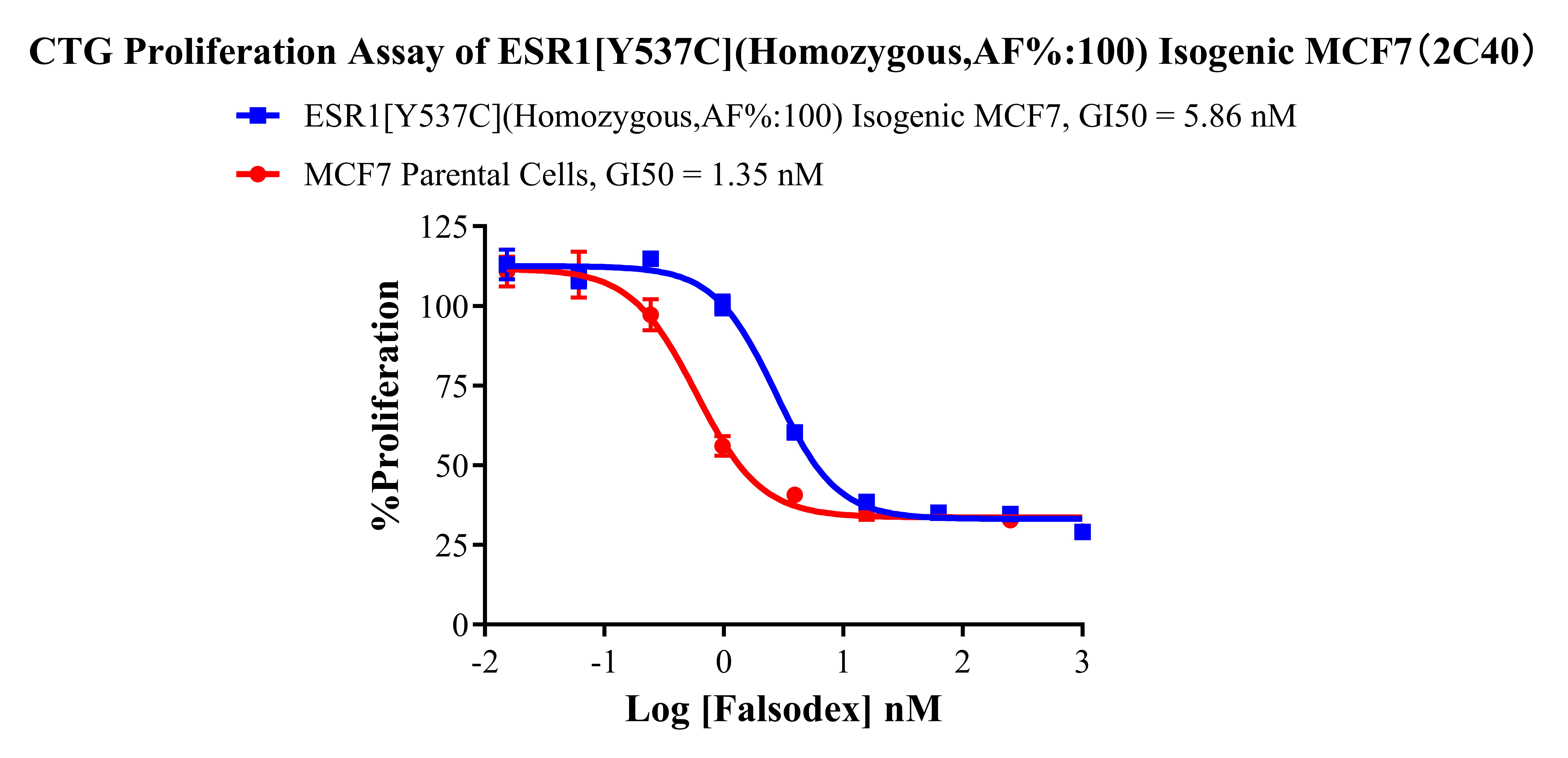 ![]() Figure 2. Sanger of ESR1[Y537C](Homozygous,AF%:100) Isogenic MCF7. ![]() Figure 3. A: MCF7 Parental Cell;B:ESR1[Y537C](Homozygous,AF%:100) Isogenic MCF7 通道2 藍色微滴代表ESR1[Y537C]突變陽(yáng)性,通道2 綠色微滴代表該位點(diǎn)為陰性野生型 ![]() Figure 4. CTG Proliferation Assay of ESR1[Y537C](Homozygous,AF%:100) lsogenic MCF7(2C40). |