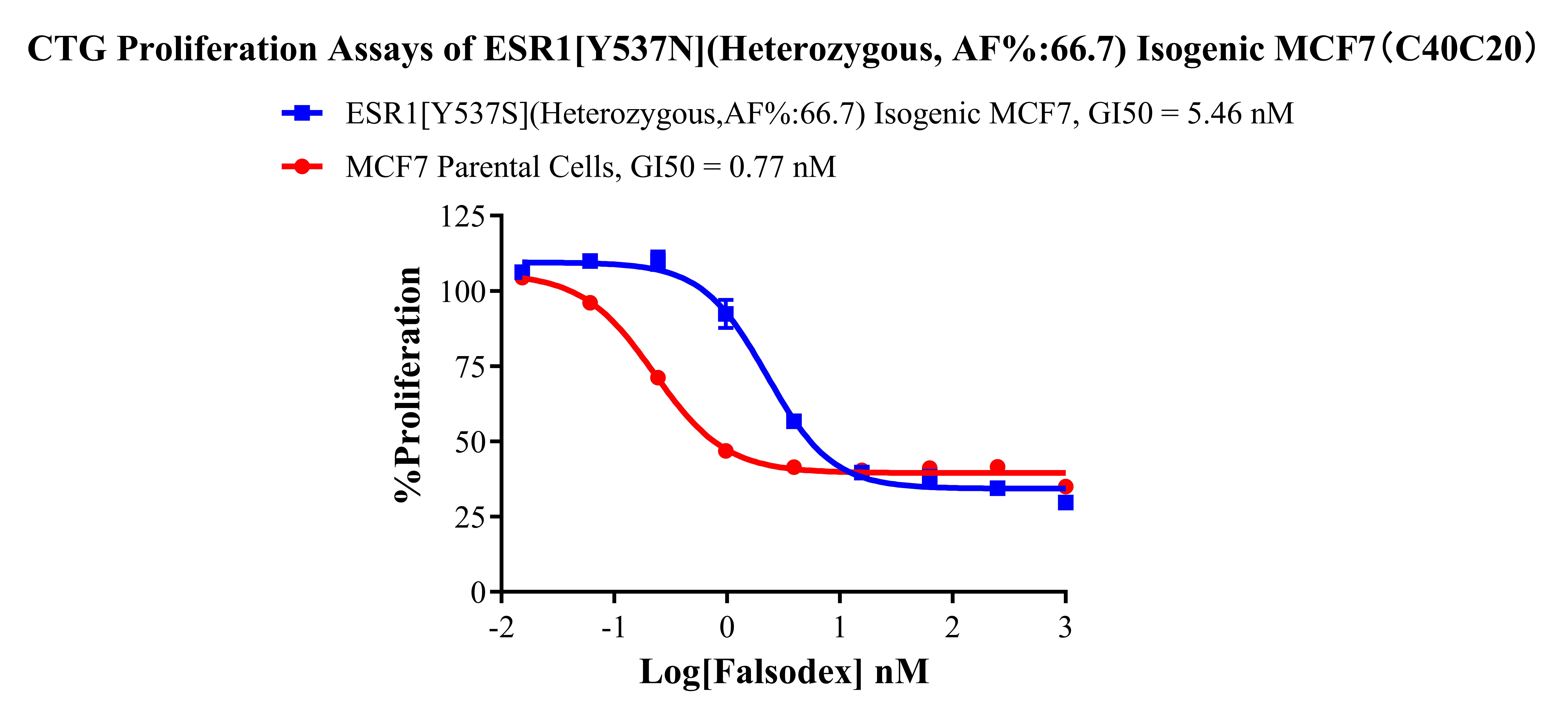 ![]() Figure 2. Sanger of ESR1[Y537N](Heterozygous,AF%:66.7)Isogenic MCF7 ![]() Figure 3. A: MCF7 Parental Cell;B:ESR1[Y537N](Heterozygous,AF%:66.7) Isogenic MCF7 通道2 藍色微滴代表ESR1[Y537N]突變陽(yáng)性,通道2 綠色微滴代表該位點(diǎn)為陰性野生型 ![]() Figure 4. CTG Proliferation Assays of ESR1 [Y537N](Heterozygous, AF%:66.7) 1sogenic MCF7(C40C20). |