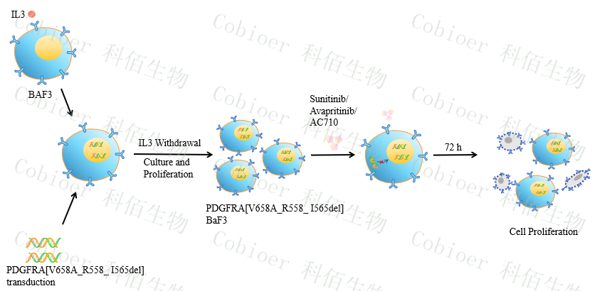 PDGFRA[V658A_R558_I565del] BaF3 藥靶細胞,通過轉導突變狀態(tài)的 PDGFRA[V658A_R558_I565del] 基因到 BaF3 細胞系中 ,穩(wěn)定表達人突變形態(tài)下的PDGFRA[V658A_R558_I565del] 基因。