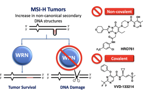 國際頂級期刊之一Nature于去年同一天上線(xiàn)了兩篇關(guān)于WRN(Werner綜合征RecQ解旋酶)抑制劑的文章,其中一篇是關(guān)于Novartis的HRO761的發(fā)現過(guò)程,另一篇介紹了拜耳(Bayer)旗下Vividion Therapeutics 公司的VVD-133214 (又叫RO7589831)的發(fā)現過(guò)程。這些文章重燃了醫藥行業(yè)對“WRN”這個(gè)合成致死靶點(diǎn)的關(guān)注。
